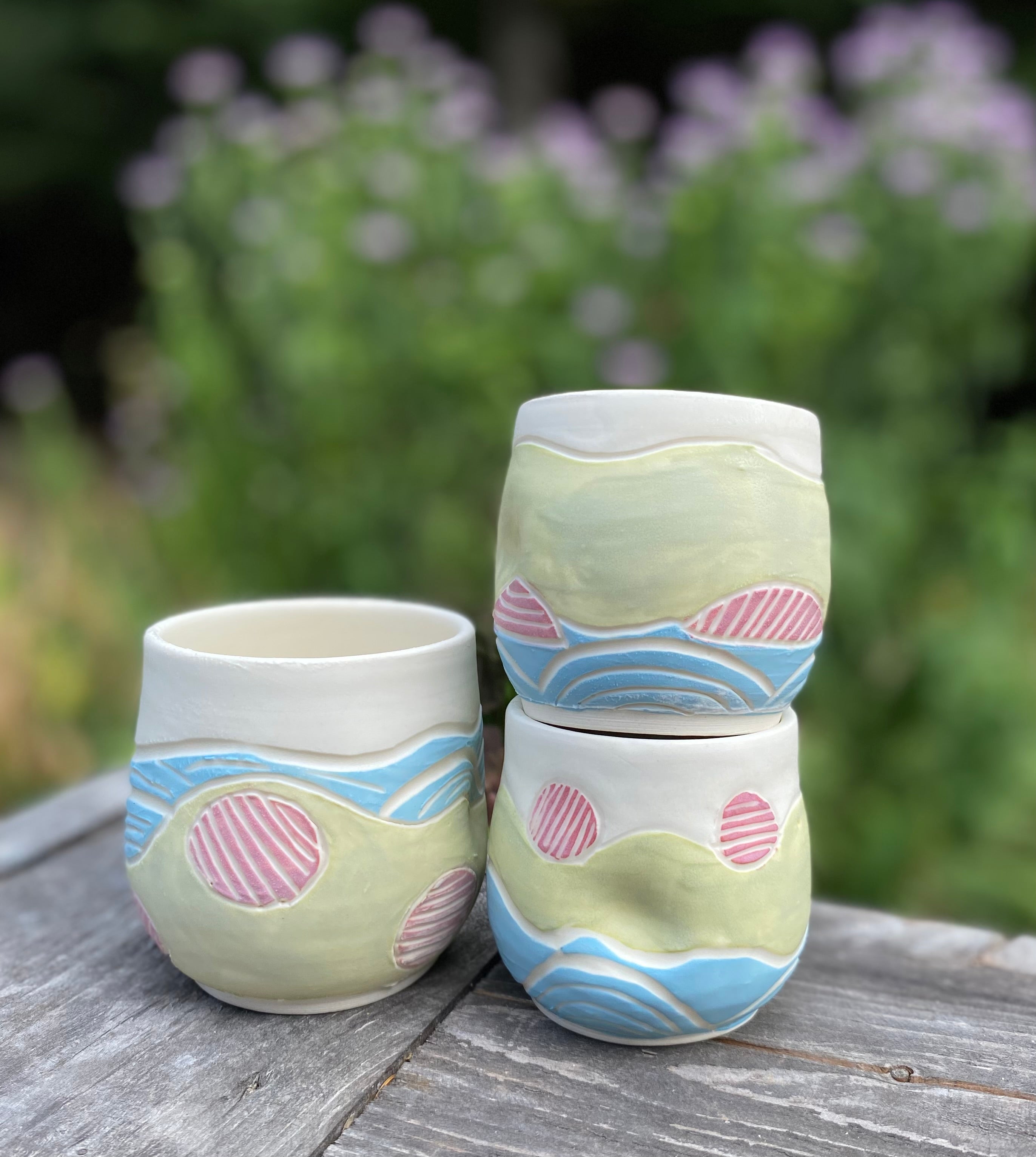 coil built pot with sgraffito carving wheel thrown blue mug garlic pots tea turtle planter dog bowl candle votive dinnerware set sgraffito tumblers with coloured slips handbuilt piggy bank slab handbuilding a teapot sculptural bust with wild harvested clay small wheelthrown vase